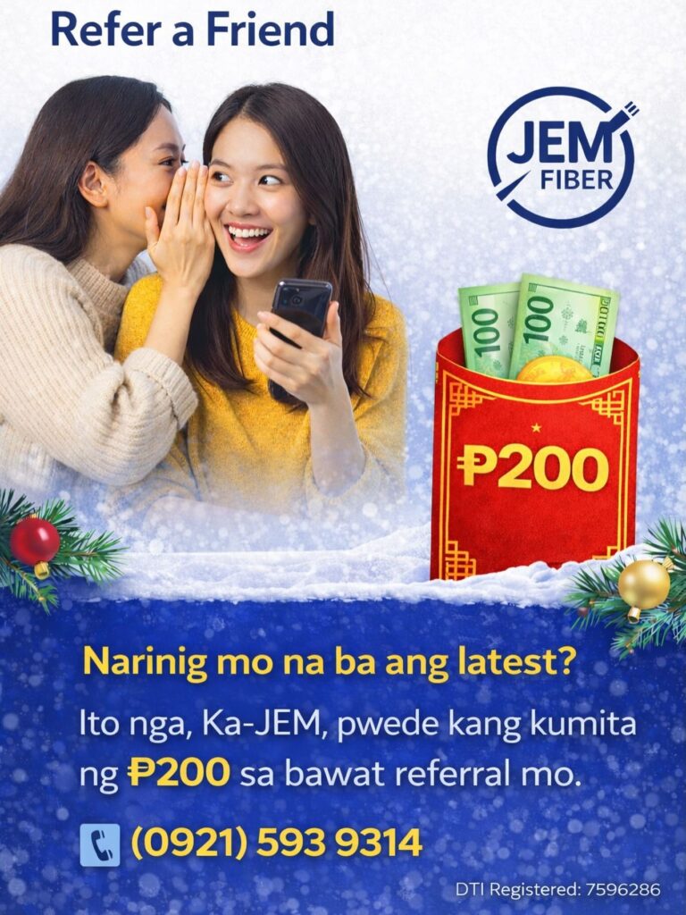 Don’t keep the speed a secret! Refer a friend, family member, or neighbor to JEM Fiber, and once theyโre successfully connected, youโll earn โฑ200 as a thank-you reward. Sharing lightning-fast, hassle-free internet has never been more rewarding!